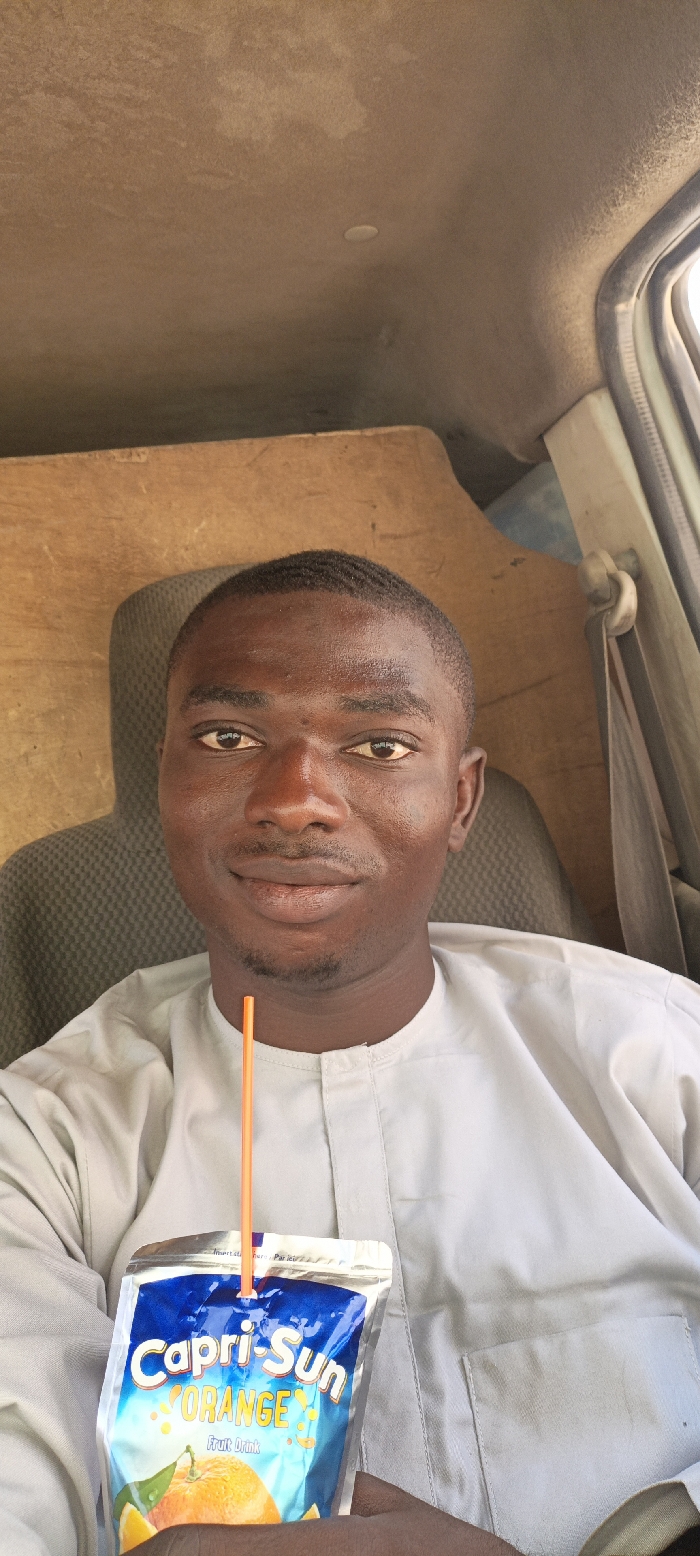 An adult male with dark skin and short, dark hair is depicted from the chest up, seated inside a vehicle. He wears a light grey long-sleeved tunic with a buttoned collar and is looking directly at the camera with a neutral expression. In his hands, he holds a blue and foil "Capri-Sun ORANGE Fruit Drink" pouch with an orange straw inserted. He is positioned in what appears to be a dark grey, textured vehicle seat. The vehicle's interior behind him features a light brown paneling or wooden surface, and the ceiling is a discolored light tan with a small circular fixture visible. A light-colored seatbelt mechanism is visible on the vehicle's right side. The scene occurs within the confines of a vehicle interior; the specific city of Tudun Wada, Nigeria, is not visually verifiable from the image content.