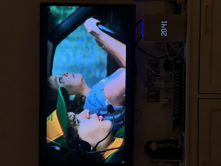 A television displays a scene from "Stranger Things," featuring Dustin Henderson in his yellow and green cap, accompanied by Joyce Byers in a vehicle. To the right of the TV, a digital clock reads "20:41" above a keyboard. Below, a black mouse sits near the wall. The background includes framed pictures and electrical outlets. Adjacent to the clock, a cupboard door with visible panels can be seen.