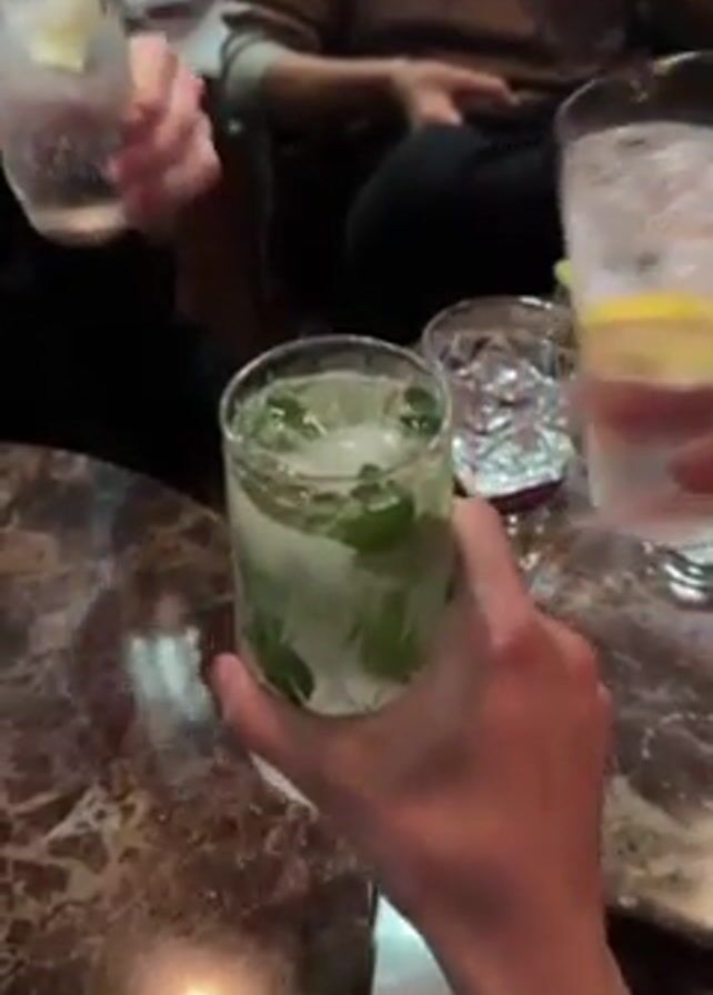 Here's a concise description of the video: The video shows a group of people toasting with drinks in a bar setting. The drinks appear to be cocktails with ice, lemon slices, and mint. A woman then raises her drink and takes a selfie, smiling and laughing. The environment looks like a dimly lit bar with marble-patterned tables. A window with a multicolored reflective coating is visible in the background.