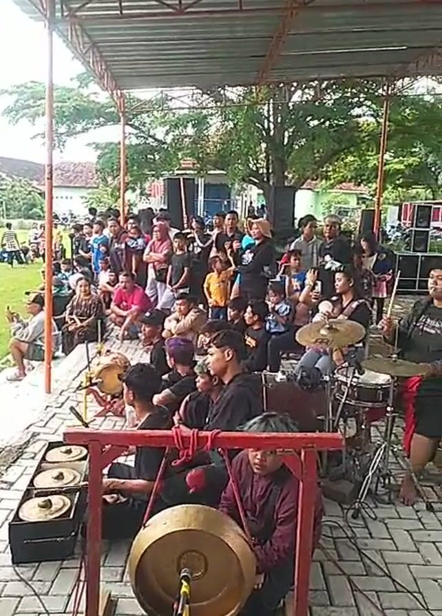 music performance outdoors, possibly at a festival or community event. A band is set up with drums, traditional percussion instruments like a gong and smaller brass instruments, and what looks like a keyboard or other electronic instrument. A crowd of people of varying ages is gathered to watch the performance. The band is playing, and the crowd seems to be enjoying the music. The setting appears to be a park or open space with a covered stage area.