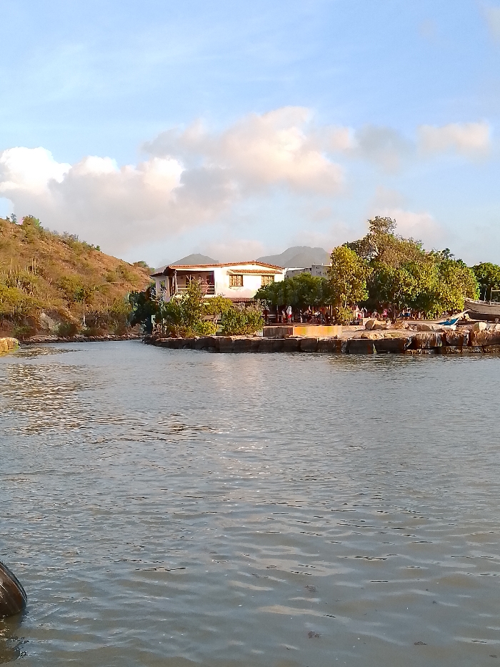 The image captures a late afternoon or early morning waterfront scene in Pedro González, Venezuela