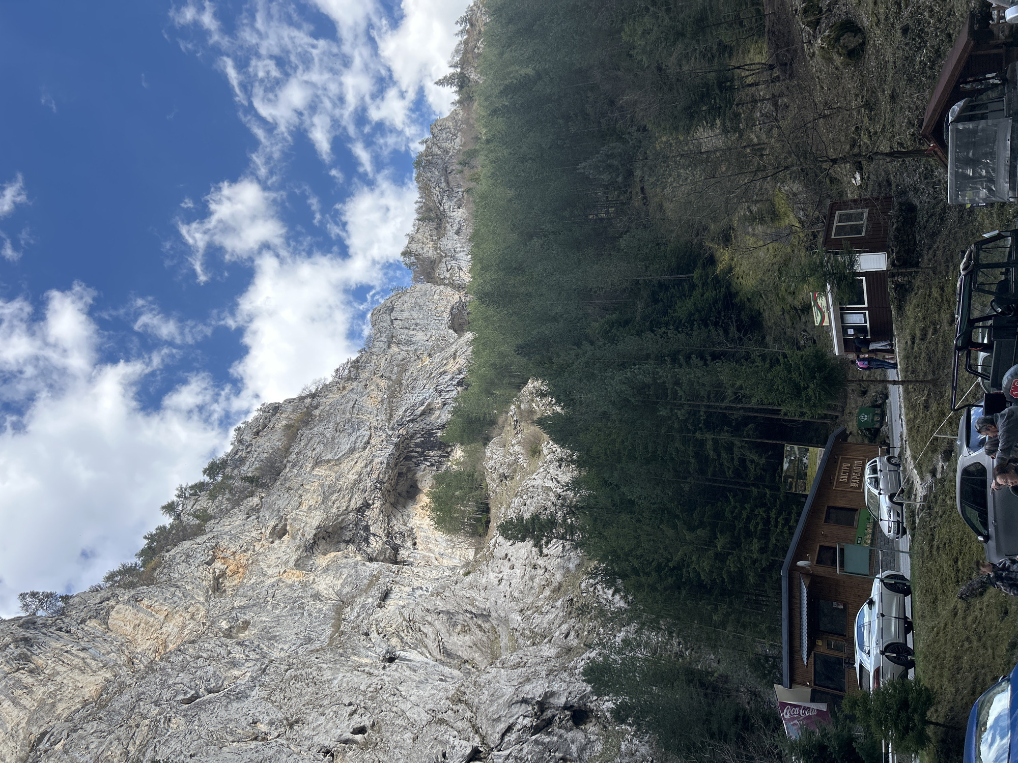rocky mountainside beside a forest and a building with the sign "Bistro Apeato" in Iagodina, Bulgaria. The sky is blue with scattered clouds. The building appears to be a restaurant or rest stop, with cars parked nearby. There are people standing outside the building. The mountainside is steep and rugged, with sparse vegetation. The forest is dense with green trees. The photo seems to have been taken in daylight on a clear day.