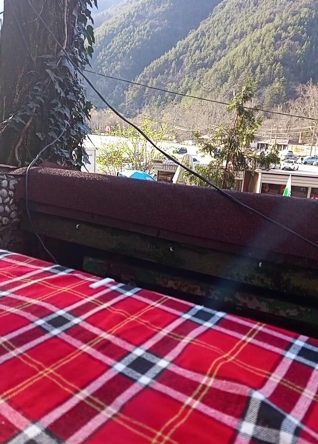 Here's a detailed description of the video: The video presents a static view of a rustic outdoor setting, likely a cafe or restaurant with a scenic mountain backdrop