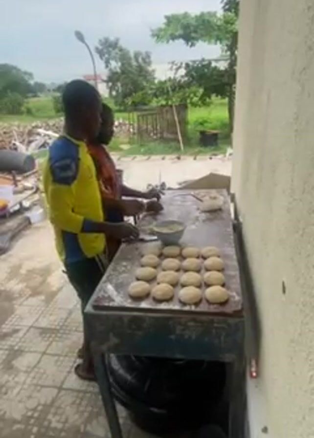 Two men stand at a table covered with small, round doughy items outside a building. The man on the left wears a yellow and blue soccer jersey and green shorts, while the man on the right wears a colorful patterned shirt. They are working on something, perhaps preparing the dough or adding a topping, using tools and a bowl in the center of the table. The setting is outdoors, with trees and other greenery visible in the background. The sky is overcast. A water tank and some clutter can be seen near the table.