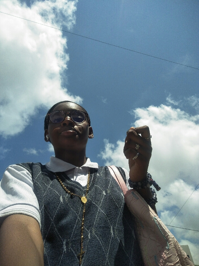 - "The image depicts a low-angle selfie of an individual, primarily from the chest upward, against a bright blue sky with scattered white cumulus clouds" by FM-YhEN42, licensed under CC BY 4.0