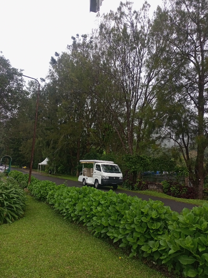 The scene depicted is located in Beni, Nepal, showcasing an outdoor environment under an overcast sky. In the foreground, a green grass lawn occupies the left side, bordered by a dense, manicured hedge of large-leafed green plants that separates it from a dark asphalt road. A white utility vehicle, resembling an extended golf cart or open-sided shuttle with a tan or yellow canopy over its rear passenger compartment, is positioned stationary on the right side of the road, angled slightly towards the left. No occupants are visible within the vehicle. To the left of the road, a tall, dark metal lamp post stands, with a dark green archway and a white conical tent visible further behind it. The background is dominated by a thick line of tall, slender evergreen trees with dark green foliage. Behind the trees on the right, a dark fence and a sign displaying white text, possibly "kanfah," are discernible. A faint, misty landscape is visible through the trees in the far right background. No people, active movements, or interactions are present in the image.