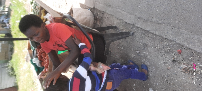 An outdoor scene in Homa Bay, Kenya, depicts an adult and a child near a produce stall