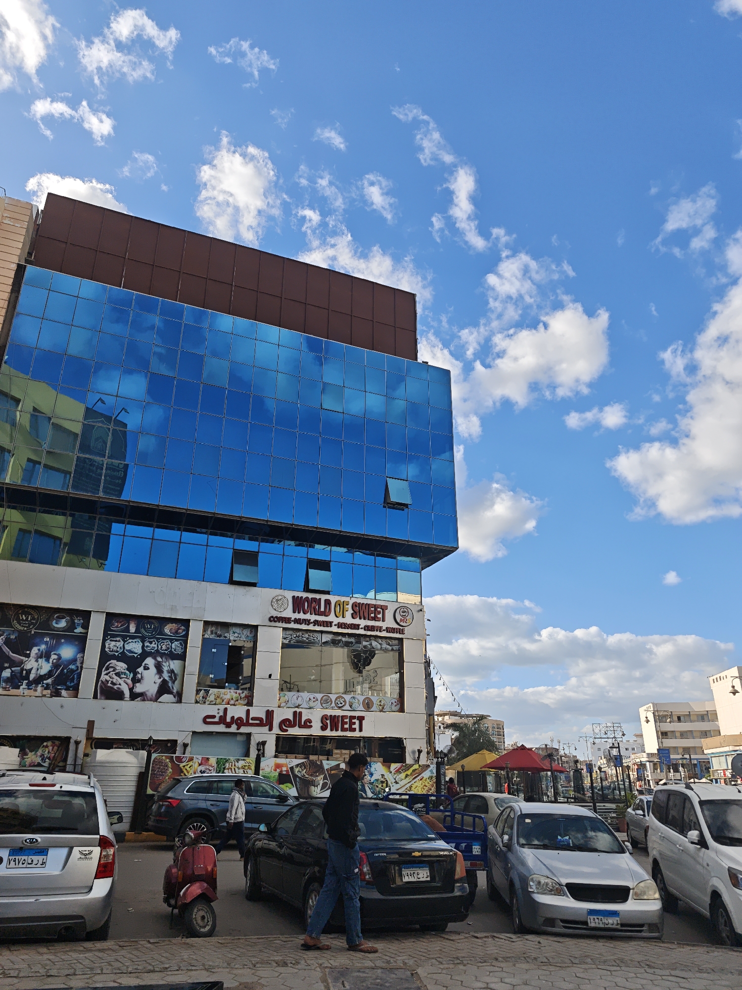 This image captures a daytime street scene in Al Hadaba, Egypt