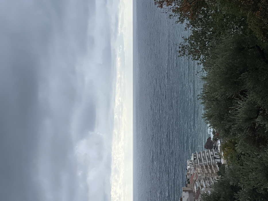 The image presents an elevated panoramic view of the Adriatic Sea and a section of the Budva, Montenegro coastline under an overcast sky. The upper half of the frame is dominated by a dense, uniform layer of grey stratocumulus clouds, with a brighter, thinner band of clouds present along the distant horizon. The mid-section features the dark blue-grey surface of the Adriatic Sea, characterized by numerous wind-driven ripples and localized whitecaps, extending uniformly to the horizon. In the lower-left quadrant, a cluster of multi-story buildings is observed, situated along the immediate coastline of Budva. These structures display light-colored facades, multiple balconies, and modern architectural elements. Directly below these buildings, rocky shorelines are visible, against which white waves are actively crashing. The lower third of the image is occupied by a dense canopy of trees and shrubs, predominantly dark green, consistent with Mediterranean vegetation such as olive trees. On the far right, deciduous trees with brown and reddish autumn foliage are present. No human figures, vehicles, or specific actions are discernible within the frame. The overall lighting is diffuse, indicative of a heavily clouded day.
