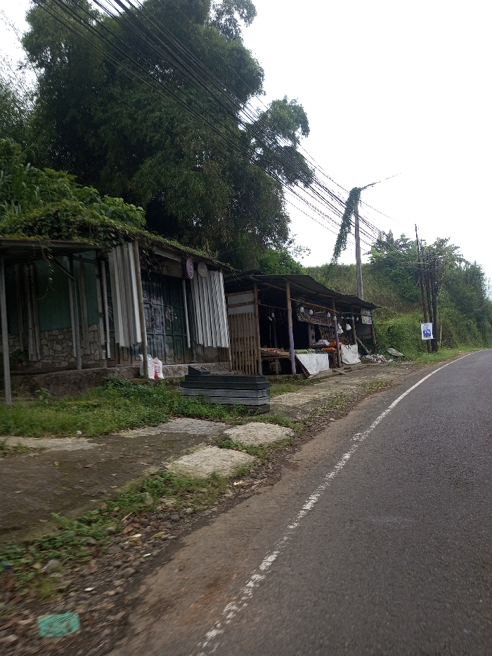 The image depicts a roadside scene in Sandamal Eliya, Sri Lanka, under an overcast sky. An asphalt road occupies the right side of the frame, featuring a white edge line. To its left, an uneven dirt and grass shoulder is interspersed with irregular concrete slabs. Along the left side of the road, a series of informal structures are visible. From left to right: 1. A partially open building with a rough stone base, light teal/green corrugated metal siding, and a corrugated metal roof heavily covered in dark green vines. The interior appears dark. 2. An adjacent closed shop featuring dark green accordion-style metal security doors and vertical corrugated metal panels as exterior siding. Several circular decorative plates are affixed to its facade. Two white plastic bags rest on the ground near the entrance. In front of this shop, a stack of approximately 5-6 dark gray or black rectangular objects, possibly plastic crates or trays, is positioned on the ground. 3. Two interconnected open-air market stalls constructed with rough wooden frames and corrugated metal roofs. These stalls display various produce, including vegetables and fruits, arranged on tables and hanging. Some produce is covered with white sheets. Behind these structures, a steep, heavily vegetated embankment rises, featuring dense green foliage and prominent clusters of tall bamboo. Overhead, a network of multiple utility wires extends across the upper portion of the frame, supported by several utility poles that run parallel to the road. One utility pole in the mid-right is substantially covered in climbing vines. Further down the road, a white rectangular sign with blue text or graphics is affixed to a slender pole. No individuals, vehicles, or animals are present in the scene.