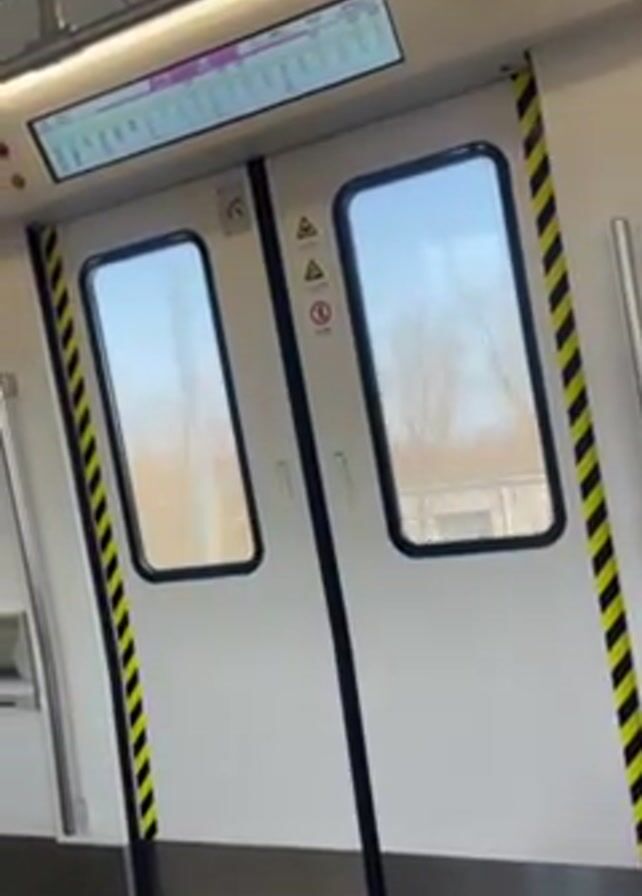 doors of a train carriage as it arrives at a station. The doors are white with two rectangular windows each. They are marked with yellow and black hazard stripes. A digital display above the doors shows the train route. Through the windows, trees can be seen, with a glimpse of a red and white object.
