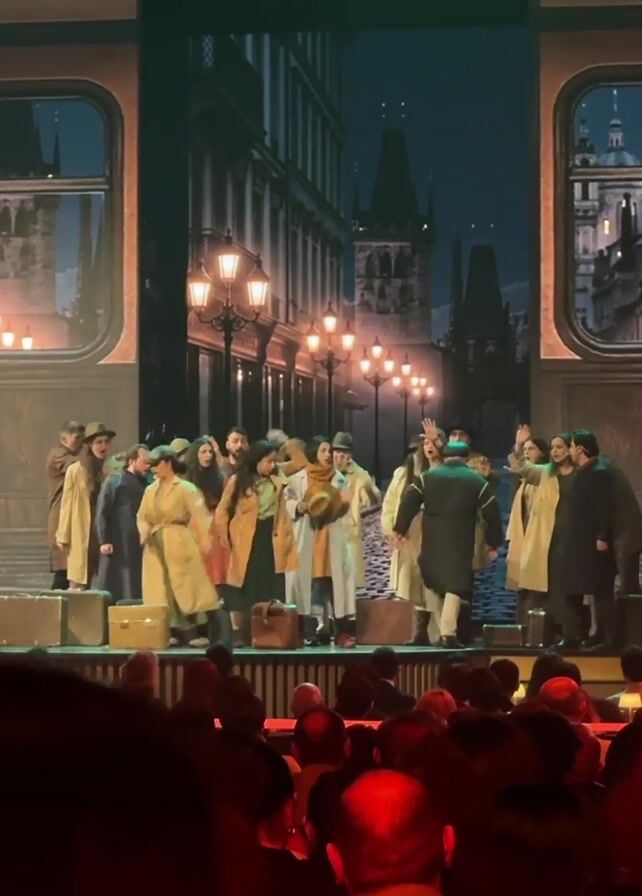A wide shot shows a live performance on a stage in front of a large audience. The stage is set to look like a train station or platform with actors dressed in vintage clothing and hats, some with luggage. Behind them, a screen depicts a nighttime city street with old-fashioned streetlights. The audience is mostly visible in the foreground, and the overall lighting creates a sense of drama.