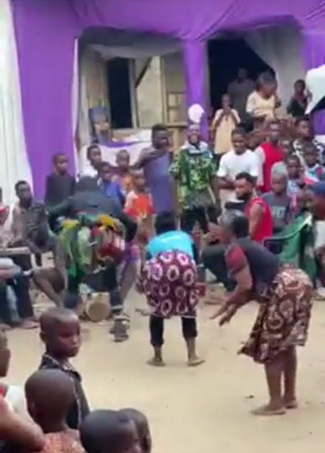 The video captures a lively scene of cultural performance in an outdoor setting. A crowd of people, including numerous children, are gathered around a central area where a person dressed in a colorful, full-body costume is dancing. Two women in skirts are also actively involved, engaging with the dancer. Some members of the crowd are recording the event with their phones. The backdrop features a structure draped with purple fabric, adding to the festive atmosphere. The environment appears to be a sandy or dirt-covered yard.