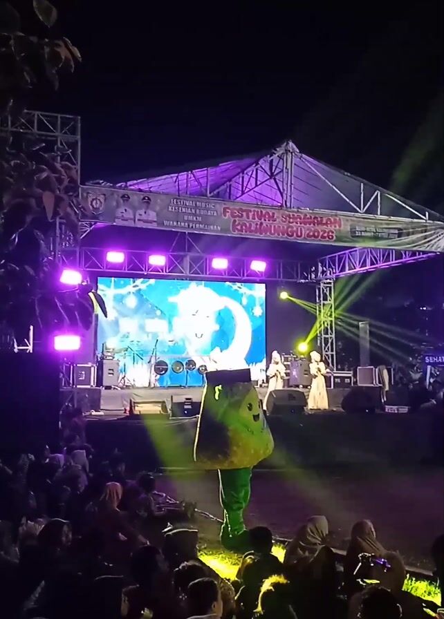 A nighttime festival scene shows a stage with a large screen displaying a cartoonish moon image. Two women are singing on stage. The stage is lit with purple and green spotlights. In front of the stage, a costumed character is dancing, dressed in green with a large, barrel-shaped head. A large crowd is watching the performance, mostly sitting or standing, many with head coverings. Trees are visible on the left side of the frame. The scene suggests a community event with live music and entertainment.
