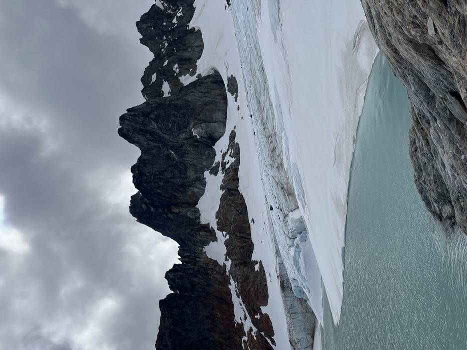 The image presents a glacial landscape near Ushuaia, Argentina, specifically consistent with the region of Laguna Esmeralda and the Vinciguerra Glacier. The foreground features a rocky, dark grey bank on the lower right, sloping towards a large body of water. This water, a glacial lake, occupies the midground, exhibiting a distinct turquoise coloration with discernible ripples on its surface. Adjacent to the lake, a significant expanse of snow and glacial ice extends, displaying light blue hues, white snow cover, and visible surface crevasses. In the background, rugged, sharp-peaked mountains rise abruptly. These mountains are predominantly dark grey and black rock, with numerous patches of white snow clinging to their slopes; some reddish-brown rock formations are also visible on the left. The sky overhead is heavily overcast with dense, grey clouds, and a brighter patch is visible in the upper central portion. No individuals, animals, or human-made objects are present in the scene.