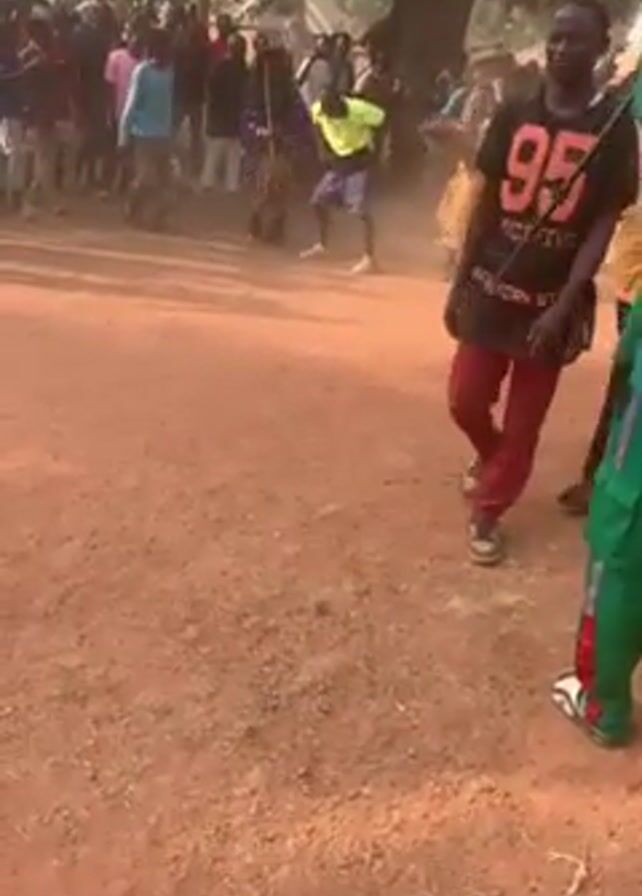group of people dancing in a dusty outdoor area. The ground is reddish-brown, suggesting a soil or clay composition. There are people of various ages and attires visible, creating a sense of community. At least one person is holding a stick or similar object. The scene seems to be set during the daytime, with natural light illuminating the area. The presence of trees in the background indicates a natural setting. The actions suggest a festive or celebratory gathering.