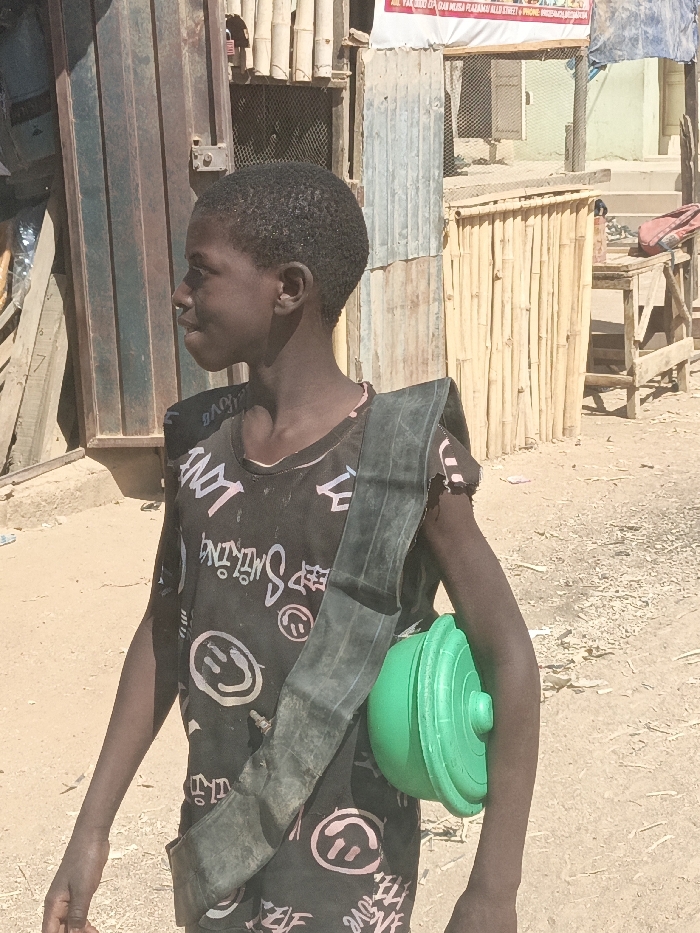 A young individual is captured in profile, facing left, standing on dry, light brown earth in Hotoro South, Nigeria. The person exhibits dark skin and short, dark, closely-cropped hair. They are dressed in a dark-colored sleeveless top featuring light-colored text and smiley face graphics, with a tear visible near the right shoulder. A wide, dark, rubber-like strap, resembling a repurposed tire inner tube, is draped diagonally across their torso, over the left shoulder. In their right hand, positioned against their hip, they hold a bright green plastic bowl with a concentric ribbed design. The background consists of various structures made from weathered corrugated metal panels, some with a rusted appearance, and vertical bamboo slats. A partial white banner with red text, including "AL YAK ZOO ZAN MUSA PLAZAA BABA STREET" and "RICE BAAN MU'AZA," is visible in the upper background. A wooden table or bench is present to the right. The scene is illuminated by strong daylight.