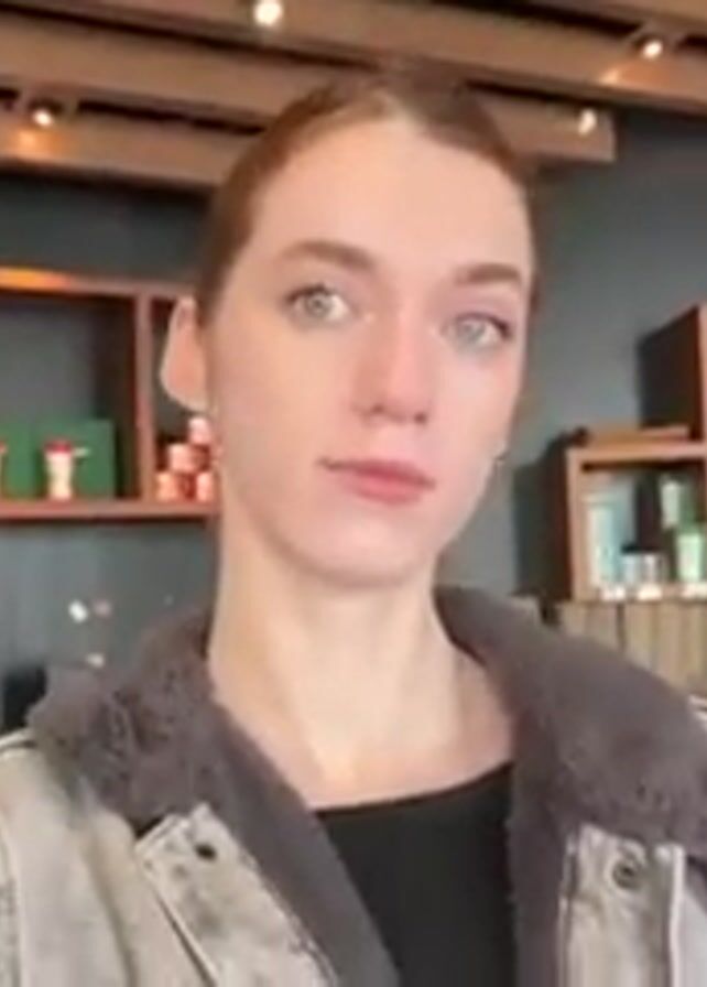 person with fair skin and light blue eyes, wearing a black top and a light grey jacket with a dark grey fur-like collar. The person is standing indoors, likely in a commercial establishment. In the background, there are wooden shelves stocked with various products, including cups, boxes, and bottles. To the left, there is a refrigerator and what appears to be a point-of-sale system. The person looks directly at the camera with a neutral expression. The lighting is bright, and the scene appears to be well-lit.