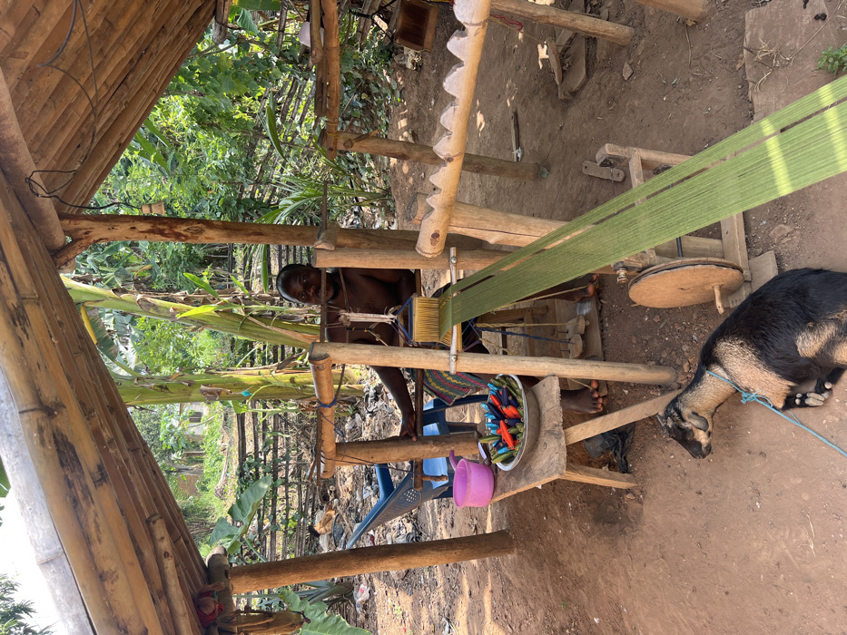 In Wuinta, Ghana, an outdoor scene unfolds under a rudimentary wooden shelter with a slatted bamboo roof, supported by rough-hewn timber poles. An adult male, dark-skinned, partially shirtless, and wearing a patterned loincloth or wrap, sits on a low wooden stool, operating a substantial wooden loom. He is focused on the weaving process, with a light-green fabric or warp threads extending from the loom's mechanism towards the foreground right. A blue and yellow reeded beater is visible within the loom structure. To the man's immediate left, a low wooden bench holds a metal bowl filled with multiple colorful objects, likely bobbins or shuttles, alongside a pink plastic bucket. The ground beneath the shelter is reddish-brown earth. In the foreground, a black and tan goat with a blue tether rests on the ground, facing left. The background reveals dense green vegetation, including large banana plants, a wooden fence-like structure, and hints of a distant building. A blue plastic chair is visible behind the weaver, amidst general debris.