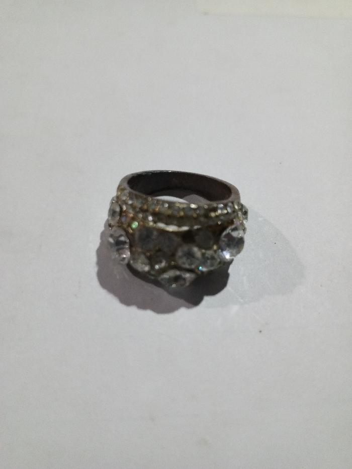 The image displays a single, broad band ring on a plain, light-colored surface. The ring is constructed from a dark-toned metal and is extensively embellished with numerous small, clear, faceted stones, arranged in a clustered pattern across its surface. Some sections of the metal setting show a tarnished or yellowish coloration. The object casts a defined shadow towards the lower right, indicating a primary light source from the upper left. No individuals or additional objects are present within the frame. The immediate environment is an undifferentiated, light background. The scene is documented in the city of Phakeo, Laos.