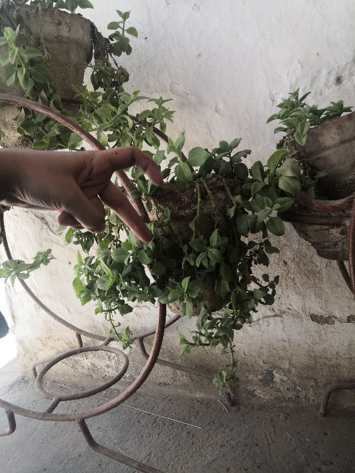 This image depicts a close-up, slightly upward-angled view of a plant display in a setting within Akhundzadakhail, Pakistan. A light-skinned human left hand with slightly curled fingers, specifically the index and middle fingers extended, is visible in the upper-left foreground, positioned above and reaching towards a potted plant. The hand shows minor surface discoloration. The central subject consists of multiple trailing green plants, possibly succulents, with small, ovate leaves and thin stems. These plants are contained within at least two visible unglazed, weathered clay or concrete-like pots. The pots are supported by a rusty, dark brown, ornamental metal stand featuring curved and circular elements, resting on a concrete floor. The background consists of a rough, off-white or light gray wall displaying significant signs of age, wear, and discolored patches. The floor is dark gray, rough concrete, showing dust and a thin, light-colored line horizontally across its surface in the lower-left quadrant. Lighting appears natural and diffuse, casting no strong shadows.