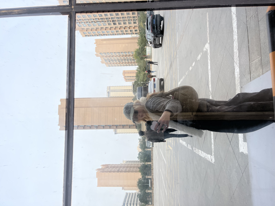 The image depicts an outdoor urban scene in Zhangye, China, observed through a reflective window pane. In the foreground, the reflection of a person taking a self-portrait with a smartphone is prominent. This individual is dressed in a distressed camouflage baseball cap, sunglasses, a light-colored furry scarf, a grey long-sleeved top, and dark pants, carrying a dark green hobo-style shoulder bag. The smartphone, held in the right hand, features a white heart-shaped accessory. Beyond the reflection, an expansive grey paved area, marked with white parking lines, extends into the midground. A male figure in a dark jacket and jeans walks away from the viewer towards the left. A white sedan is parked or stationary in the mid-right section of the paved area, facing left, while a black SUV is parked further right, facing away from the viewer. Several other indistinct pedestrians are visible in the distance. The background is dominated by multiple tall, light-brown/beige multi-story urban buildings, consistent with residential or commercial structures, featuring numerous rectangular windows. Some buildings display distinct architectural elements at their rooftops. The sky is uniformly overcast and light grey. A low decorative barrier with sparse vegetation lines the far edge of the paved area.