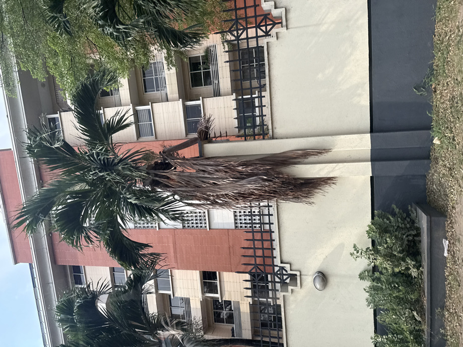 The image displays a multi-story building in Falomo, Nigeria, viewed from a low angle. In the foreground, a light-colored concrete wall with a dark grey base spans the width of the frame, topped by a black metal fence featuring geometric diamond patterns. An oval-shaped exterior light fixture is mounted on the wall to the left. At the wall's base, a dark-colored concrete planter box holds green bushes. The immediate ground consists of sparse dry vegetation and dirt, with a piece of white debris visible. Two palm trees are prominent; one positioned centrally in the foreground has a crown of dark green fronds and a significant cluster of dried, brown fronds hanging vertically from its trunk, partially obscuring the fence and wall. A second palm tree is visible on the far left. The building beyond the fence exhibits a facade composed of red-orange brick sections alternating with light cream-colored panels. It features multiple floors with numerous rectangular windows, some displaying horizontal blinds, and several balconies with dark metal railings. A central vertical section of white, perforated architectural blockwork is also visible. The sky above the building appears overcast. No individuals or specific actions are depicted in the scene.