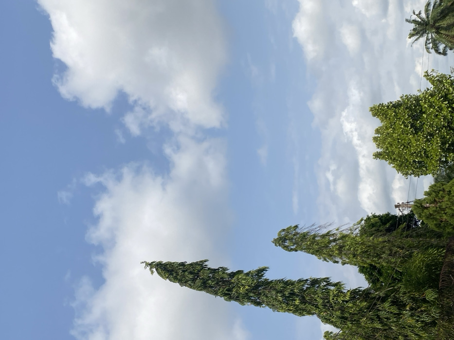 The image displays an outdoor daytime scene in Achara, Nigeria. The upper two-thirds of the frame consist of a light blue sky with scattered white cumulus clouds. The lower third features the tops of various trees. Two tall, slender, dark green trees with dense, downward-sweeping foliage are prominent on the left side, extending high into the frame. To the right and below these, a utility pole with dark wires is partially visible. Further to the right, a tree with a rounded crown of lighter green, dense foliage is present. A segment of a palm tree's fronds is visible in the bottom right corner. No individuals or specific actions are depicted.