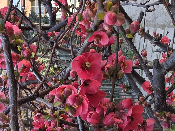 - "The image displays a close-up, high-angle view of a flowering bush identified as a Flowering Quince (Chaenomeles speciosa), located in Plovdiv, Bulgaria" by FM-Yg6Sn2, licensed under CC BY 4.0