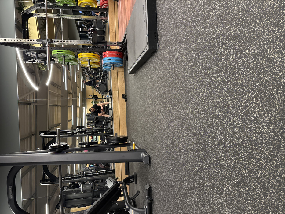 The image depicts an indoor gym facility. The floor is composed of dark grey speckled rubber. A large mirrored wall at the back reflects the gym interior. In the foreground, to the left, is the base of a black adjustable weight bench. Central to the frame, a grey Smith machine or squat rack structure is visible. To the right, a black Eleiko lifting platform rests on the floor. Further right and in the midground, a squat rack or power rack stores various colored weight plates: green, yellow, red, and blue. Reflected in the mirrored wall, a male individual is seated on a weight bench in the background, looking down at a mobile phone. He has dark hair and a beard, wearing a black t-shirt and dark shorts. A pair of black shoes and a water bottle are positioned on the floor in front of him. Another male individual is visible in the reflection to the far right background, appearing to use a cardio machine. The ceiling features modern curved strip lighting, also reflected in the mirror. A wooden paneling runs along the base of the mirrored wall. The precise location within the city of West Suffolk, United Kingdom, is not discernible from the image.