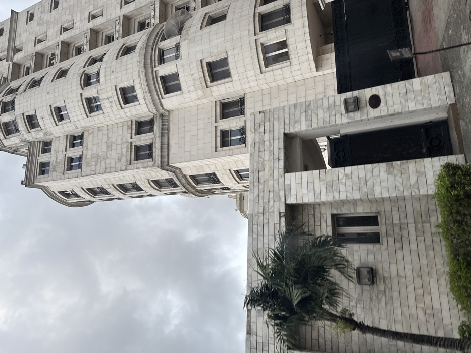 The image displays a multi-story building in Falomo, Nigeria, under an overcast sky. The structure is characterized by its light-colored, possibly marble or stone, block cladding and a prominent design featuring curved sections and a rounded turret-like element extending upwards. Numerous windows, some with dark frames and decorative wrought-iron balconies or guards, are visible across the facade. At ground level, a matching light-colored wall with two large, ornate dark metal vehicle gates and a smaller pedestrian gate provides access. A dark circular plaque and a wall-mounted light fixture are present near the pedestrian gate. To the left, a slender palm tree with green fronds stands beside the wall, with a low green hedge running along its base. No individuals are visible in the scene.