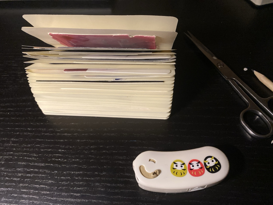 A stack of rectangular, beige notecards with colorful notes sits on a dark, textured surface. To the right, a pair of scissors and a small wooden dowel are visible. A white, bean-shaped object with a slot on one end and illustrations of three colorful Daruma dolls in a row decorates the bottom. The surface exhibits a wood-grain pattern.