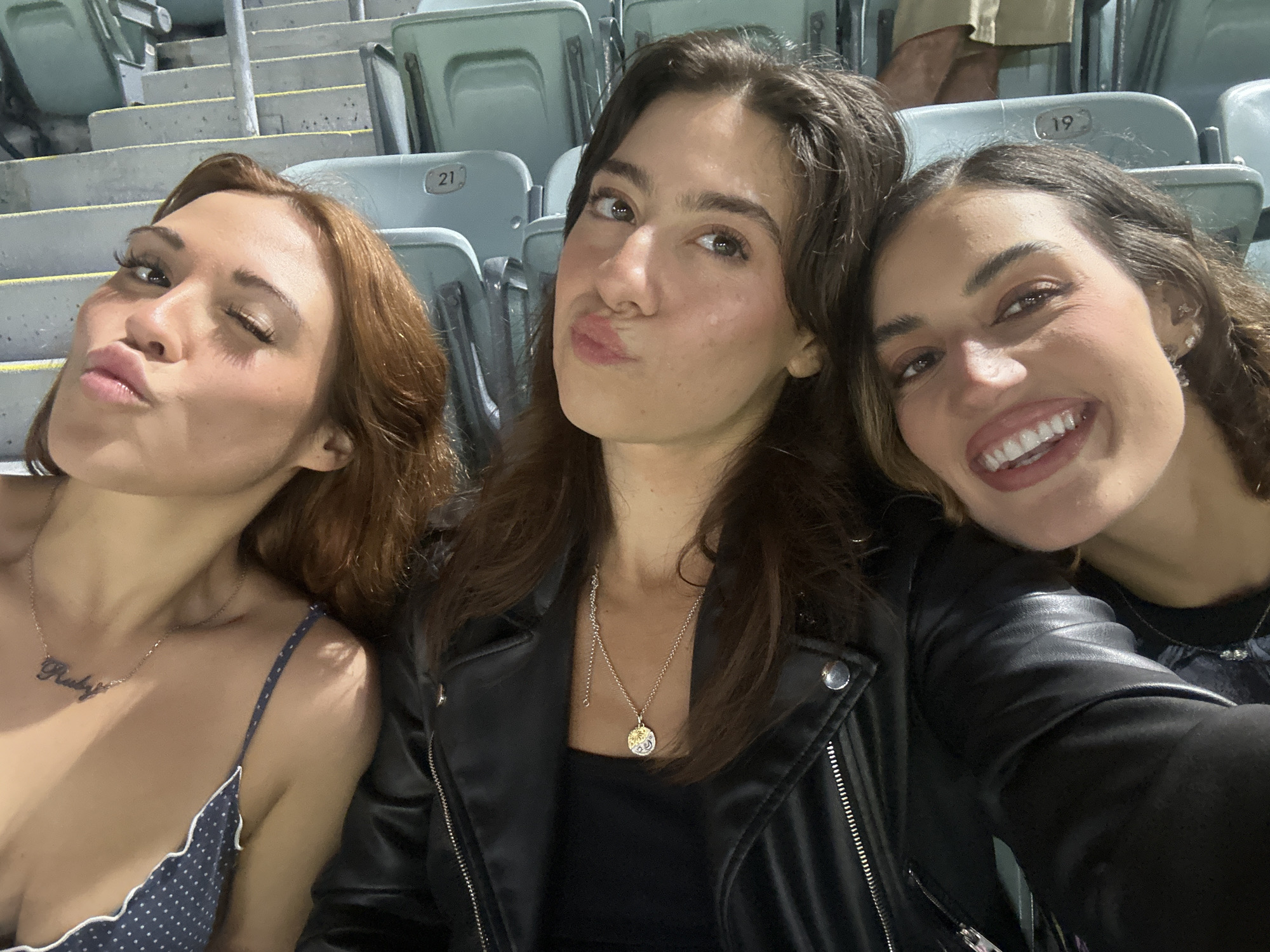 Three young adult females are depicted in a close-up selfie within the stadium seating area of Dodger Stadium in Los Angeles, California, United States of America