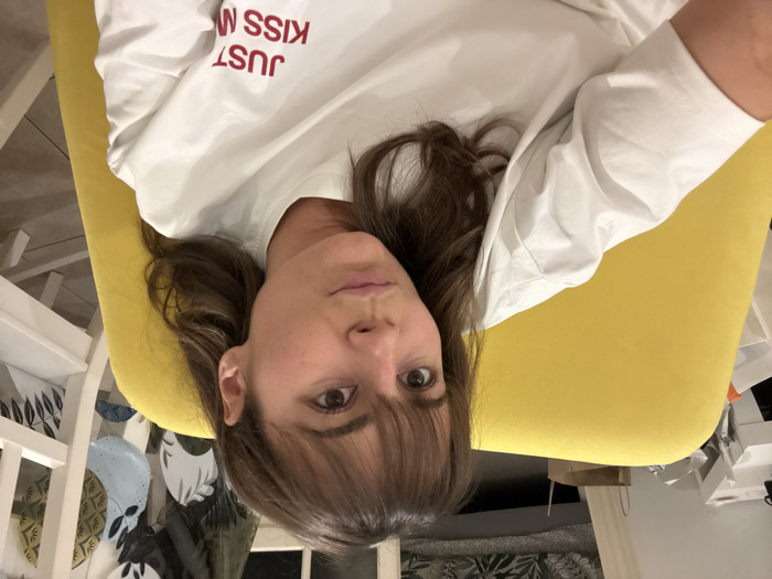 A woman with brown hair and bangs is lying on a yellow chair, looking directly at the camera. She's wearing a white long-sleeved shirt with the red words "JUST KISS ME" on the front. The background shows a glimpse of a white table, possibly with some decorated items, and various objects scattered around, indicating an interior setting. The image is slightly rotated.