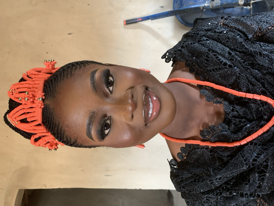 A single adult female is depicted in a close-up, chest-up portrait shot, located indoors in Angwa Koyo, Nigeria. She faces forward, looking directly at the camera with a subtle smile. Her hair is styled in dark cornrows, over which she wears a prominent, intricately crafted headpiece composed of numerous orange-red coral beads, accented with small gold beads. Her face features full makeup, including defined eyebrows, dark eyeshadow with winged eyeliner, long eyelashes, and glossy, light pink lips. She wears matching orange-red coral beaded stud earrings and a long, multi-strand necklace of similar coral beads draped over her chest. Her attire consists of a black lace garment with a detailed floral or geometric pattern and some subtle sequins, covering her shoulders and upper torso. The background is a light brown or tan textured wall, possibly unpainted plaster or mudbrick. To the left, a darker vertical opening or doorway is partially visible. To the right, a blue object, resembling a plastic container or bucket, is partially obscured, with a red-tipped handle of a tool or implement leaning against the wall beside it.
