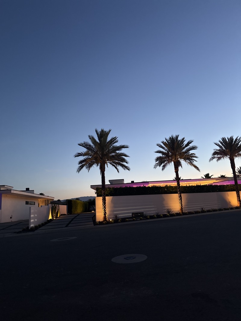 The image depicts a street scene in Indio, United States, at dusk. The sky transitions from a deep blue at the top to a lighter hue near the horizon. Three palm trees line a low white wall that runs along a property. The wall is illuminated with purple and orange light. A modern-style house with flat roofs is visible on the left. The street in the foreground is dark, with a circular object in the center.