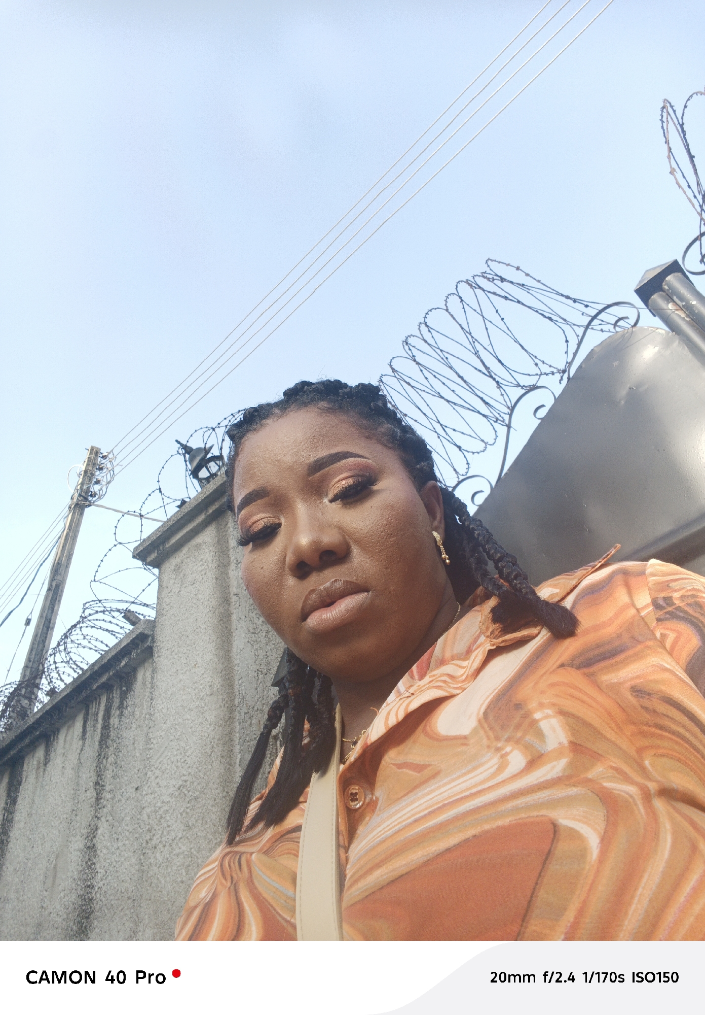 The image presents a woman in an orange patterned shirt. She is facing the camera with a slightly downward gaze. She has dark hair styled in braids and makeup. The background features a concrete wall topped with barbed wire, and an electricity pole with wires. The location is Lekki, Nigeria.