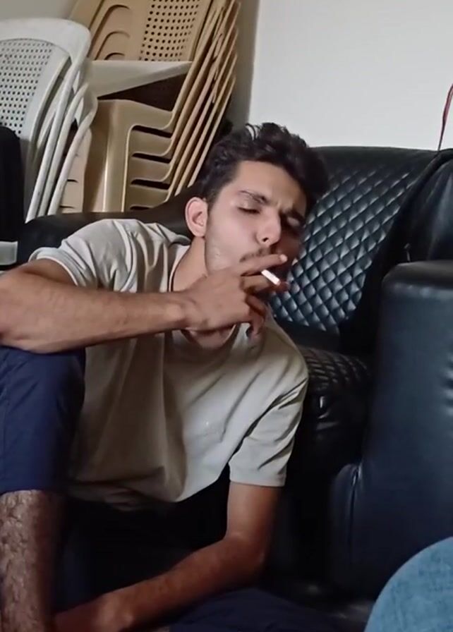 A young man is sitting cross-legged on the floor, leaning against a black, diamond-stitched leather sofa. He is wearing a light-colored t-shirt and dark pants. He is holding a lit cigarette in his right hand and exhaling smoke. Several stacked plastic chairs are behind him. Another person is sitting beside him, partially visible in the lower right of the frame. The walls are white.