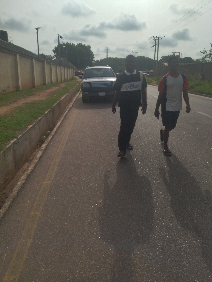 two men walking on a paved road in Asuir, Nigeria, a city located at latitude 7.68 and longitude 8.536. The men are walking in the same direction, side-by-side, with a black SUV parked on the right side of the road. The man on the left is wearing a black shirt with a white inscription, black pants, and black shoes. He has a bag slung over his shoulder. The man on the right is wearing a white shirt with a red and blue design, blue shorts, and black flip-flops. He has a backpack on. The road is asphalt, with yellow painted lane markings. The road is bordered by a concrete curb and grassy areas. There is a concrete wall on the right side of the road, behind the grassy area. There is also a building in the background, beyond the grassy areas and the wall. The sky is overcast. The shadows of the two men can be seen on the asphalt road. There are power lines overhead.