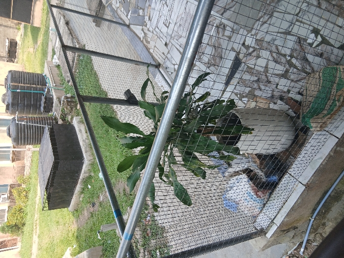 An outdoor scene is depicted from an elevated vantage point, showcasing a utilitarian area. A metal fence with horizontal silver pipes and a square mesh grid spans the mid-ground, separating a tiled patio from a grassy plot. In the immediate foreground, behind the fence on the left, a large potted plant with broad, dark green leaves stands in a tall, light-colored cylindrical pot. Adjacent to the plant on the left, a blue and white patterned plastic sack and other indistinct items are present behind the mesh. To the right of the plant, a green patterned sack lies on its side. The ground beneath these items and extending to the right features a mosaic of broken light-colored tiles. A grey pipe runs horizontally along the base of a concrete wall in the lower left. Beyond the fence, a patch of green grass occupies the ground. Situated on the grass are several dark-colored utility structures. Two prominent black cylindrical water tanks with corrugated sides rest on a raised concrete platform, interconnected by green plastic piping. A smaller black box, possibly a pump or control unit, is located near these tanks, also with green piping. To the left of the water tanks, a large rectangular black structure with a flat top, possibly a covered cistern or storage unit, sits on a concrete base. A third black water tank is partially visible to the far left. In the background, light-colored building structures with visible windows are present. An external air conditioning unit is mounted on one of these buildings. Sparse vegetation, including some trees or bushes, is visible between the structures. The overall scene indicates a functional outdoor space, likely part of a residential or commercial property. No individuals or specific actions are visible. The location within the city of Unknown, Unknown, cannot be determined from the image.