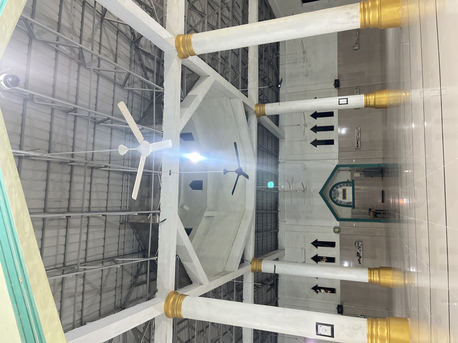The image depicts the empty interior of a prayer hall, likely a mosque, in Lhokseumawe, Indonesia