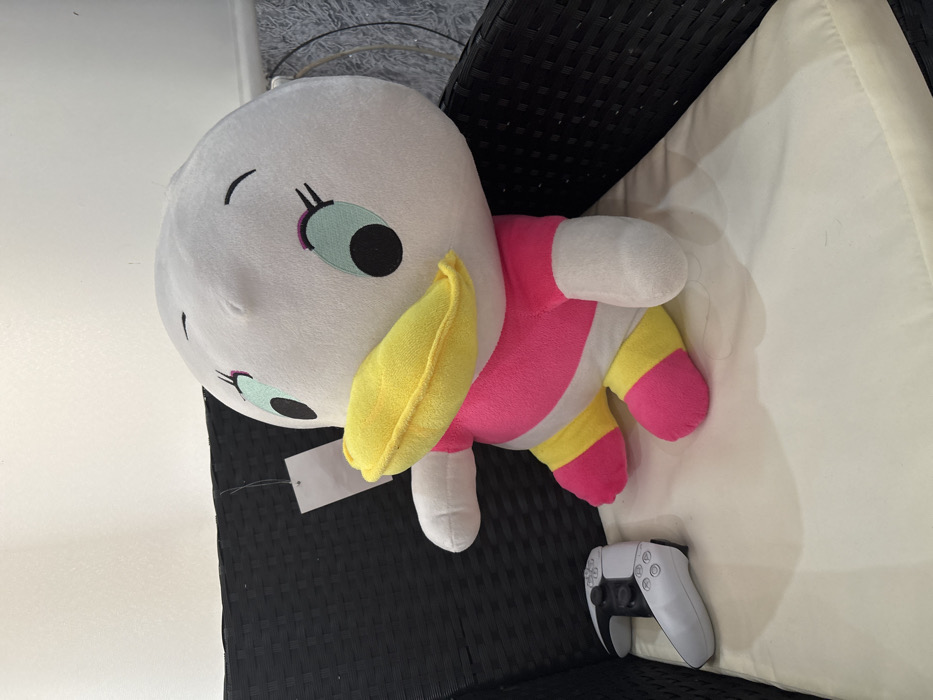 This image captures an indoor scene in Slavyanovo, Bulgaria. A large, white, duck-like plush toy, featuring a yellow beak and light blue eyes with black pupils, is centrally positioned. The plush toy is wearing a horizontally striped outfit in bright pink, white, and yellow. A white product tag hangs from its left side. The toy is seated upright on a light cream-colored cushion. To the left of the plush toy, a white PlayStation 5 DualSense controller rests on its side on the same cushion. The cushion is supported by dark brown woven wicker-style furniture. The background consists of a plain, light-colored wall.