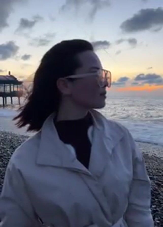 A woman stands on a pebble beach, facing towards the ocean at sunset. She has short dark hair that is blowing in the wind and is wearing large, square-framed sunglasses, a black sweater, and a light beige trench coat. The coat is tied at the waist. To the left of the frame, there is a pier with a building on the end stretching out into the water. The sky is filled with clouds, with the setting sun visible on the horizon. Waves are gently lapping at the shore. The overall lighting is muted due to the twilight hour.