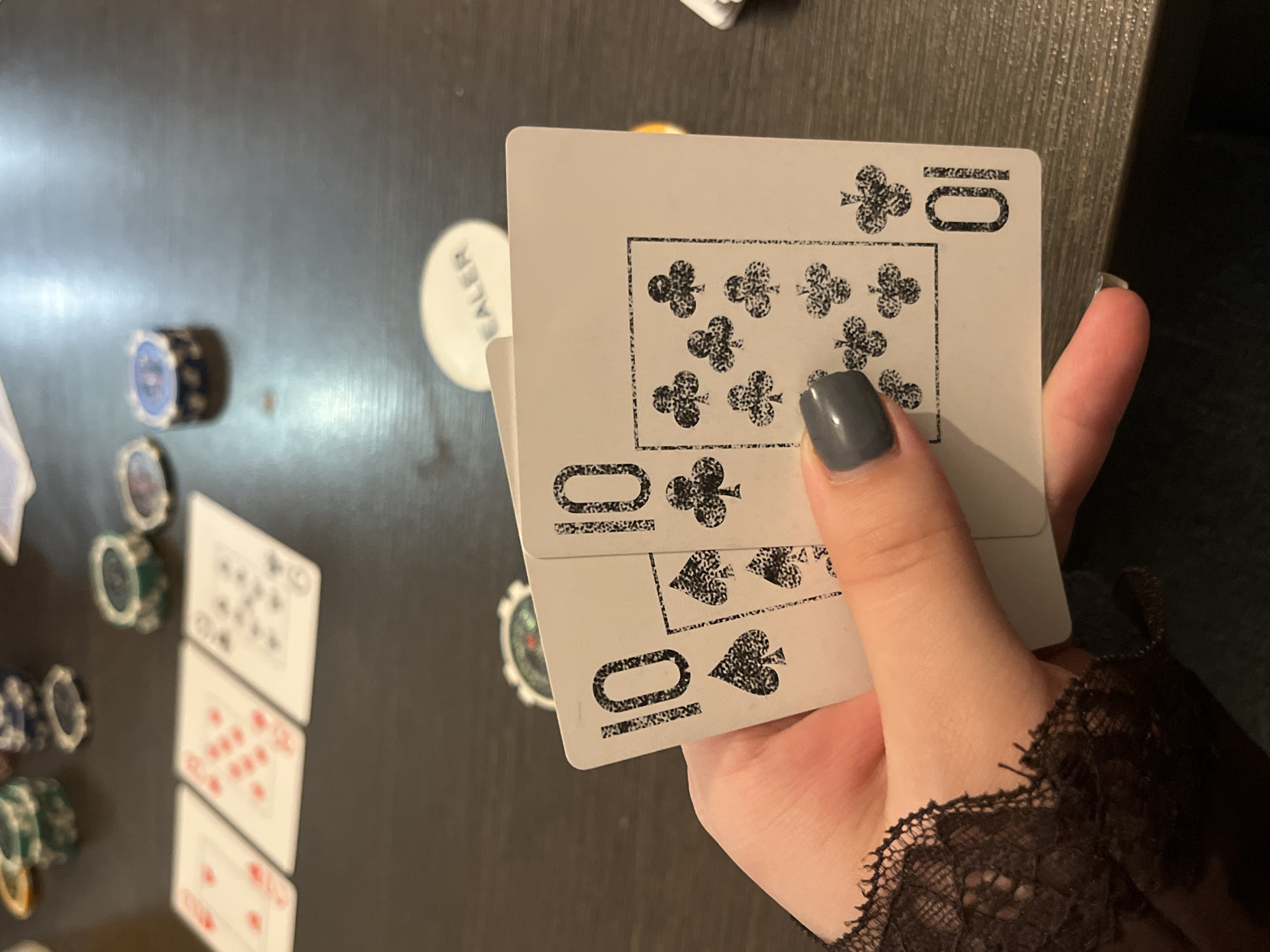 person holding two playing cards, a 10 of Clubs and a 10 of Spades. The background is a dark surface with various poker chips and a dealer button scattered on it. The scene appears to be indoors. There is no information to indicate this image was taken in the city of Neftekamsk, Russia.