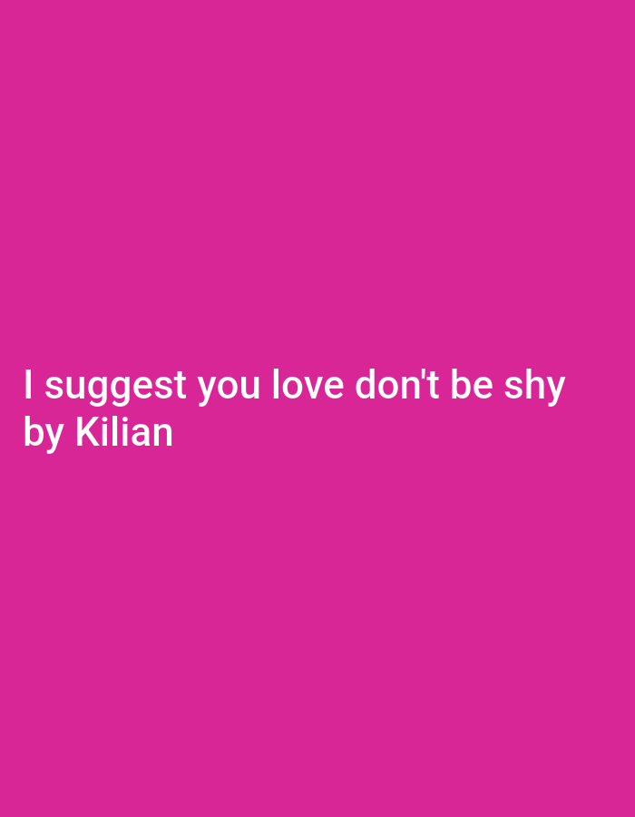 The image displays a solid magenta-pink background. White text is positioned in the lower-left quadrant, stating: "I suggest you love don't be shy by Kilian". No discernible scene, specific objects, individuals, actions, or interactions are visually depicted. The image does not contain any contextual or visual information to identify a location within the city of Fez, Morocco.