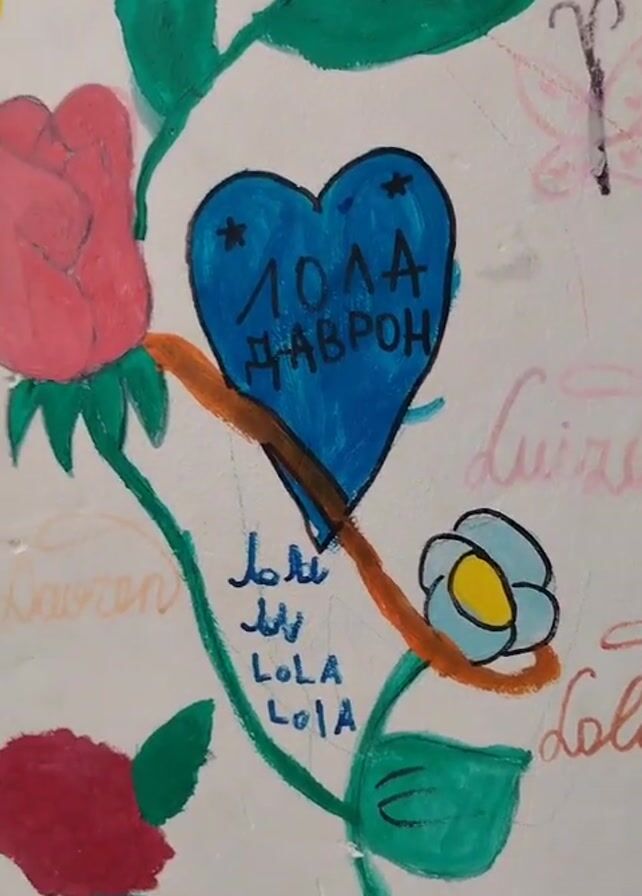 close-up of a painting featuring colorful flowers, leaves, and a blue heart with the name "LOLA" written in what appears to be a Cyrillic script. The painting is framed and has other names like "Luiza" and "Lauren" written on it. The background is white with visible cracks. There's also a butterfly and other small drawings scattered around. The camera slowly pans upwards to reveal more of the painting.