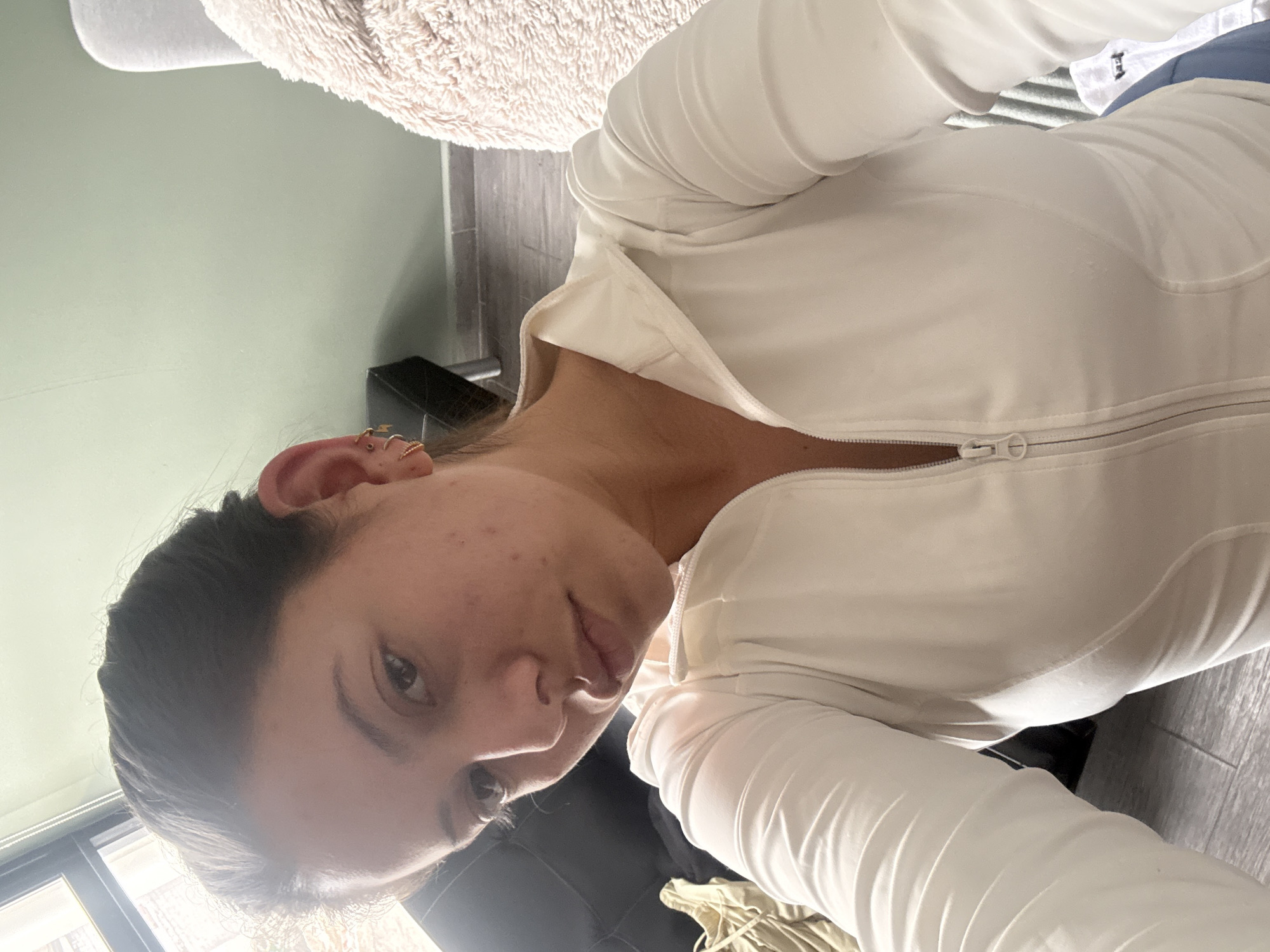 The image depicts a female individual, appearing to be in her 20s or 30s, positioned in an indoor setting within San Bernardino Tlaxcalancingo, Mexico. She is looking directly at the camera with a neutral expression, her head slightly tilted. Her dark hair is pulled back from her face. She wears a white, long-sleeved, zip-up top, which is partially unzipped. Multiple small, gold-colored earrings are visible on her right ear, including a hoop, a stud, and a charm. The background consists of a light green wall and a dark tiled floor. To the subject's left, a dark upholstered furniture item and a window frame admitting bright light are partially visible. To her right, a light-colored, fluffy textile object is present. The scene is illuminated by ambient light, with a significant light source originating from the left. Minor blemishes are visible on her face.