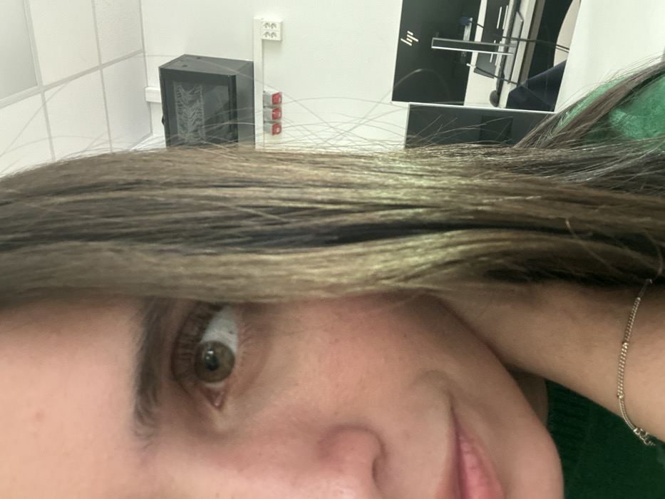 The image captures the left side of an individual's face within an office setting located in Madrid, Spain. The subject's left eye, with a brown iris, is open and directed towards the upper right. Light brown hair, exhibiting lighter streaks, partially covers the right side of the face. The individual wears a green garment, and a thin, multi-beaded bracelet is visible on the left wrist, which rests against the neck and jawline. The background features a white wall and a white acoustic grid ceiling. A black rectangular electronic enclosure is mounted high on the wall. Below this unit, a white cable management channel contains three red industrial electrical outlets and two white CEE 7/3 (Schuko-type) power outlets. To the right and lower in the frame, two black HP brand computer monitors are visible on a white desk.