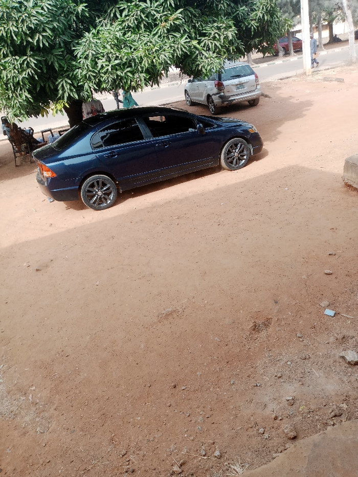 The scene in Tudun Nupawa, Nigeria, depicts an outdoor area with a mix of unpaved earth and a paved road, observed under daylight conditions with visible shadows indicating a clear sky. In the midground, a dark blue four-door sedan, consistent with an 8th-generation Honda Civic, is parked on reddish-brown dirt, angled right and partially facing the paved road. The vehicle features tinted windows and multi-spoke black alloy wheels. Its rear bumper and a single exhaust pipe are visible. To the right, another vehicle, a silver five-door SUV or station wagon, is parked on the paved asphalt road behind the blue sedan, also facing right. This silver vehicle exhibits what appears to be minor impact damage or discoloration on the left side of its rear bumper. On the left side of the frame, a large, leafy green tree provides shade over a section of the dirt ground. Beneath this tree, at least two individuals are present. One is seated on a wooden bench, while another person is partially visible near a small table or stand. Their specific activities are not discernible. The foreground consists of uneven, reddish-brown dirt with scattered small rocks and minimal light-colored debris. A concrete block or curb is visible in the lower right corner. Beyond the parked vehicles, the paved road continues, and in the far background, a red vehicle is partially visible. A single individual is seen walking along the right side of the paved road in the distance, partially obscured by a vertical utility pole or similar structure.