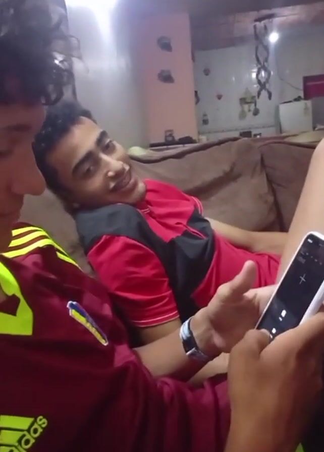 Two people are sitting on a couch in a living room. The person holding the phone is wearing a maroon Adidas shirt with yellow stripes, and is looking down at the phone. The other person, leaning back on the couch, is wearing a red shirt with a black stripe. The living room has light pink walls and a dark brown couch. A light fixture is hanging from the ceiling. The person holding the phone has a smartphone in their hands, possibly an iPhone, and appears to be using it. At one point, the phone’s camera lens is obscured by the person’s hand.
